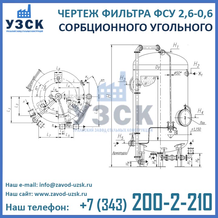 Изготовление сорбционных угольных фильтров ФСУ 2,6-0,6 в Старом Осколе осуществляется из стали. Корпус аппарата представляет собой цилиндрическую обечайку из стального листа с приваренными к ней сверху и снизу штампованными днищами эллиптической формы. Для монтажа на фундамент, фильтр оснащен тремя опорами. Для присоединения трубопроводов обвязки в центре днищ имеются фланцы. Корпус аппарата снабжен двумя люками-лазами, необходимыми для загрузки сорбента, осмотра, ремонта и обслуживания фильтра. Внутри фильтра расположены нижнее сборно-распределительное устройство (НРУ) и верхнее (ВРУ).