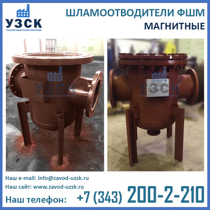Уральский завод стальных конструкций (УЗСК) осуществляет изготовление шламоотводителей ФШМ Ду80 любой сложности (как типовых исполнений, так и по техническим характеристикам и чертежам заказчика). Фильтры ФШМ-80 выпускаются исключительно из высококачественного нового сырья и комплектующих, проходящих строгий входной контроль при участии собственной лаборатории НК завода УЗСК, аттестованной на все виды неразрушающего контроля. Вся готовая продукция подвергается гидравлическим испытаниям пробным давлением на аттестованном гидростенде завода.
